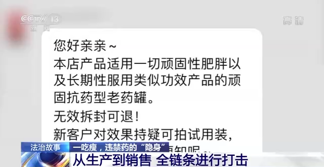 警方侦查发现,犯罪嫌疑人刻意夸大效果,把这款违禁减肥产品包装成安全又高效的神药,甚至许下没有效果包退款的承诺,很多消费者都被这些噱头迷昏了头。