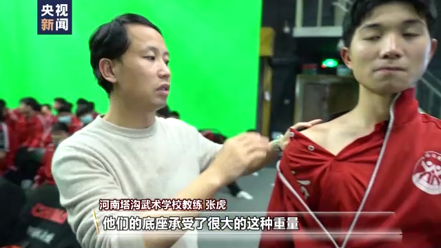 河南塔沟武术学校教练 张虎:四层人塔底座的人,等于上面大概加起来有三四百斤,他们的底座承受了很大这种重量。
