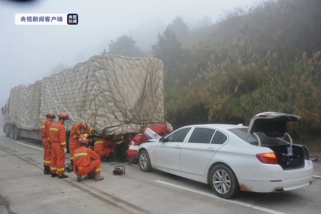 事故发生后,岑溪市交警、消防、医疗等部门迅速赶往现场处置。在事故现场,两辆小车与前方货车发生追尾,中间小车整个车身几乎钻进了货车车底。