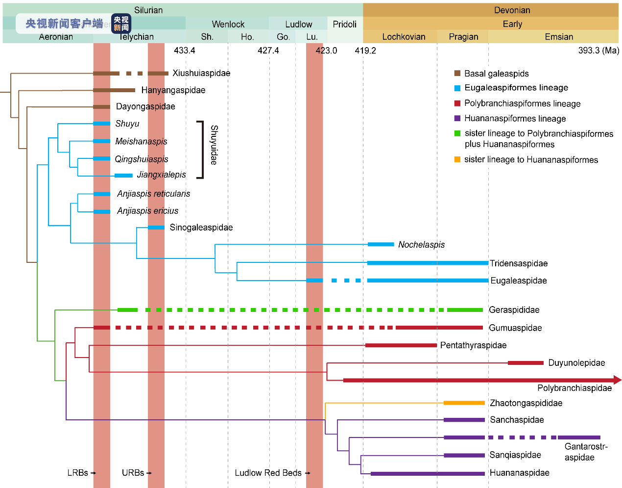 中国华南地区志留系自下而上发育三套浅水海相红层(紫红色细碎屑岩),因其颜色醒目,易于识别,而被我国地层古生物学者俗称为下红层、上红层和罗德洛统红层,其时代分别为兰多维列世特列奇早期、中—晚期和罗德洛世晚期。赣西北地区的清水组和西坑组分别属于下红层和上红层。盔甲鱼分类学新进展和化石产出记录表明:下红层清水组中的真盔甲鱼类包括清水鱼和安吉鱼,清水鱼属于曙鱼科,该科是真盔甲鱼类中目前最原始的一个单系群,安吉鱼则代表了曙鱼科向中华盔甲鱼科过渡的一个类群;而上红层西坑组中的真盔甲鱼类包括中华盔甲鱼和裂吻鱼,二者均属中华盔甲鱼科,该科是比曙鱼科和安吉鱼属更进步的一个单系群。因此,清水组和西坑组中的鱼类化石组合截然不同,分别代表了真盔甲鱼类不同的演化阶段,这为华南扬子地区志留纪上、下红层的划分对比提供了一个古鱼类学对比标准。产自浙西北地区唐家坞组中的盔甲鱼类包括曙鱼、煤山鱼和安吉鱼,之前的分类学研究根据“总体形态相似性”曾将唐家坞组中的曙鱼等真盔甲鱼类和西坑组中的中华盔甲鱼进行对比,进而认为唐家坞组和西坑组层位相当,其时代为志留纪兰多维列世特列奇晚期。这次研究,基于系统发育分析得到的分类学结论则清楚表明:唐家坞组中的曙鱼、煤山鱼和清水组中的清水与构成一个单系类群——曙鱼科;唐家坞组中的网状安吉鱼和清水组中的刺猬安吉鱼则构成另一个单系类群——安吉鱼属;上述两个单系群均较上红层西坑组中的中华盔甲科更为原始;浙西北地区唐家坞组应归入下红层、可与清水组进行很好对比;曙鱼的时代应修订为大约4.38年前的志留纪兰多维列世特列奇早期。(总台记者 宋大珩 郭一淳 帅俊全 熊方)