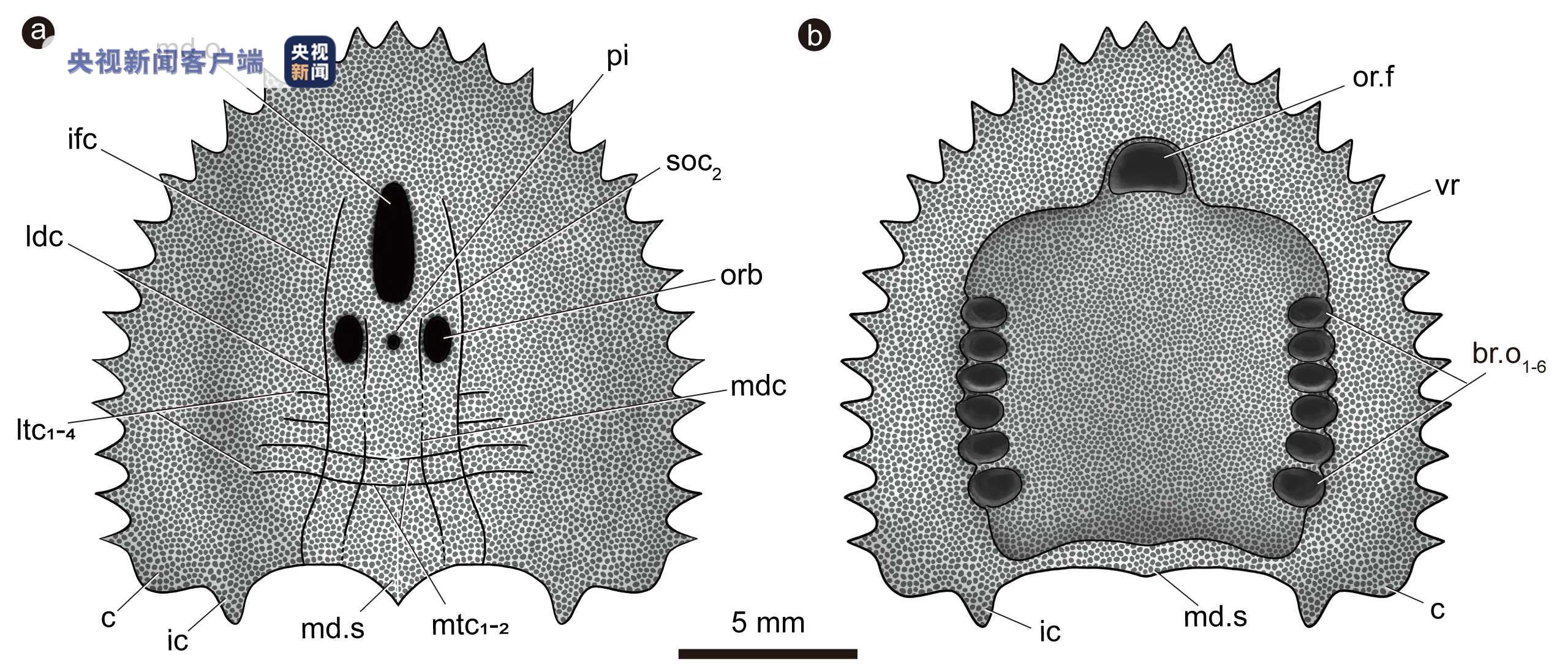 刺猬安吉鱼是继浙江安吉发现网状安吉鱼之后,第二个可归入安吉鱼属的真盔甲鱼类,种名源自其特有的头甲锯齿,粗大尖锐的锥状锯齿规则排列于头甲的侧缘及前缘,像一头布满尖刺的刺猬,让捕食者望而远之(图3)。安吉鱼的侧线系统一直以来存在争议,最初认为其侧线系统由4条纵贯头甲的纵行管和8条与之相联络的横行管组成,且纵行管与横行管交织成格栅状,后来安吉鱼的这一格栅状侧线系统被认为是对皮下脉管丛的误判。刺猬安吉鱼的发现证实了安吉鱼的侧线系统具有两对纵行干管(包括中背管、后眶上管、眶下管和侧背管)和至少两条中横联络管,属于典型的真盔甲鱼型侧线系统。刺猬安吉鱼除了具有真盔甲鱼目的典型特征之外,还具有一系列高度特化的特征,如水滴状中背孔、眶孔和侧背管极度靠近头甲中线、头甲具有宽大的腹环、向后延伸的U-型中背管。新的系统发育结果显示,安吉鱼是介于曙鱼科和中华盔甲鱼科之间的单系类群,其高度特化的身体结构可能代表了真盔甲鱼目一个特殊的演化支系。