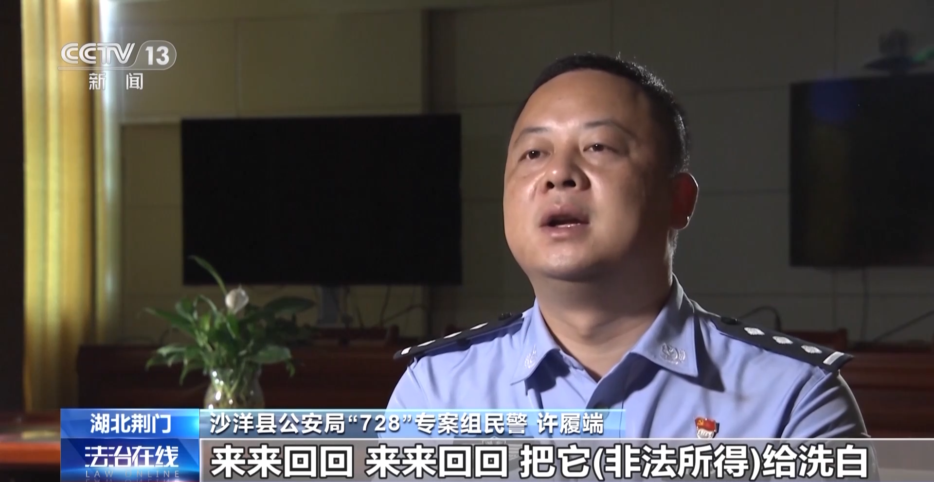 沙洋县公安局“728”专案组民警 许履端:大量资金往他们那边走,所以说他们就是提供这个虚拟币账户,对他们进行中间的一个互转,转到这个账户再转到那个账户,来回倒,最终转到网赌平台指定的一些虚拟币账户,来来回回,把非法所得洗白。