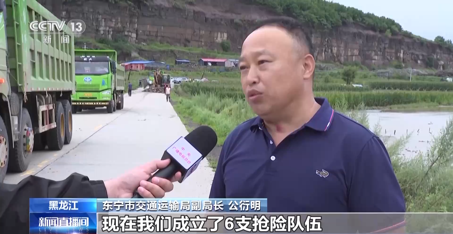 东宁市交通运输局副局长 公衍明:现在我们成立了6支抢险队伍,70多人、59台(套)设备抢修水毁路段,争取尽快恢复交通,恢复群众的生产生活秩序。
