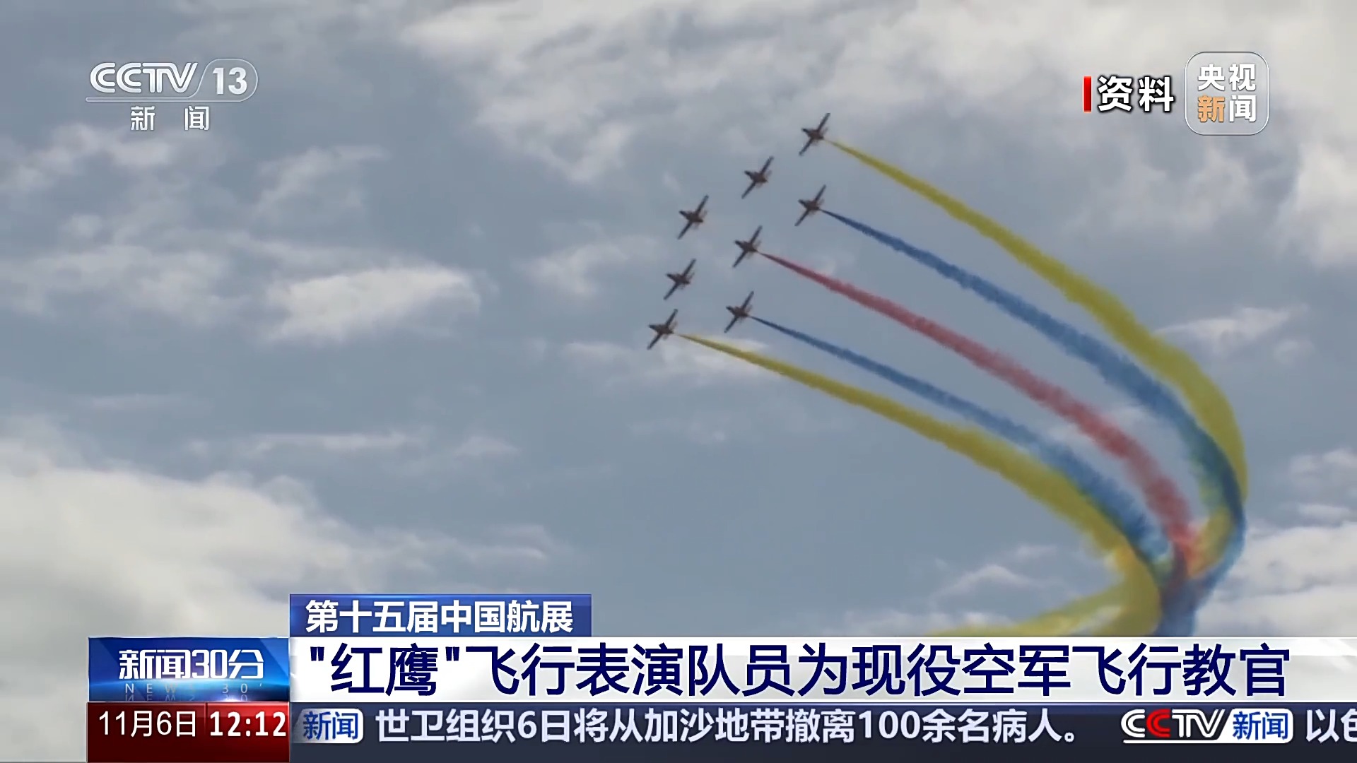 总台记者 曲柏宇:我现在所在的地方是中国航展的室外展示区,在我身后非常帅气地向我们飞来的这组飞机,就是我国的“红鹰”飞行表演队,现场可以听得到,“红鹰”划过的声音非常大,也吸引了所有在场的目光。