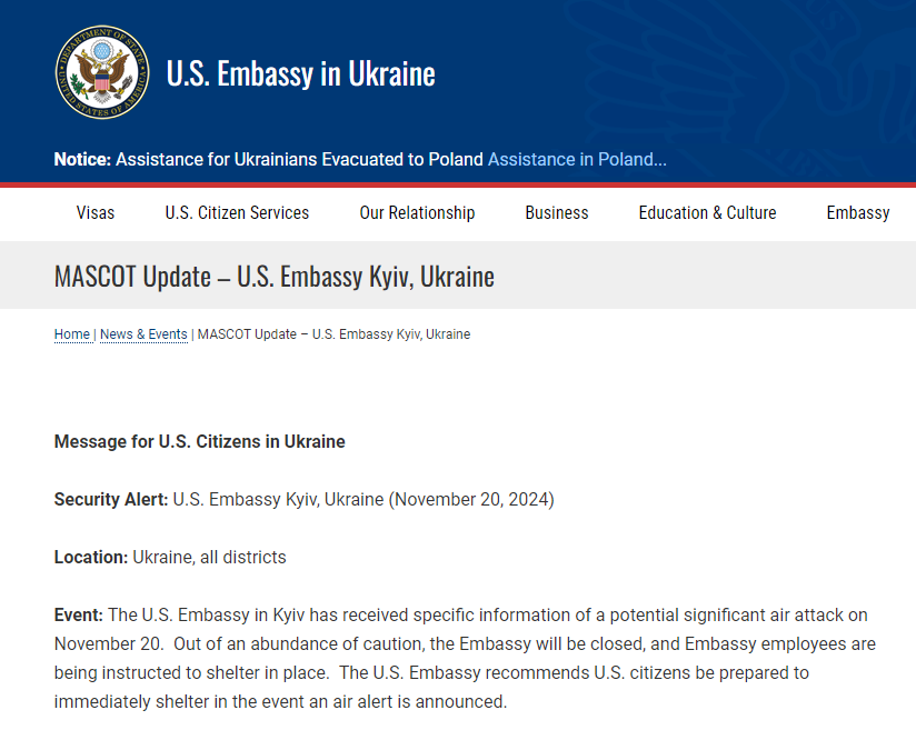 △美国驻基辅大使馆官网发布安全警报信息(截图)