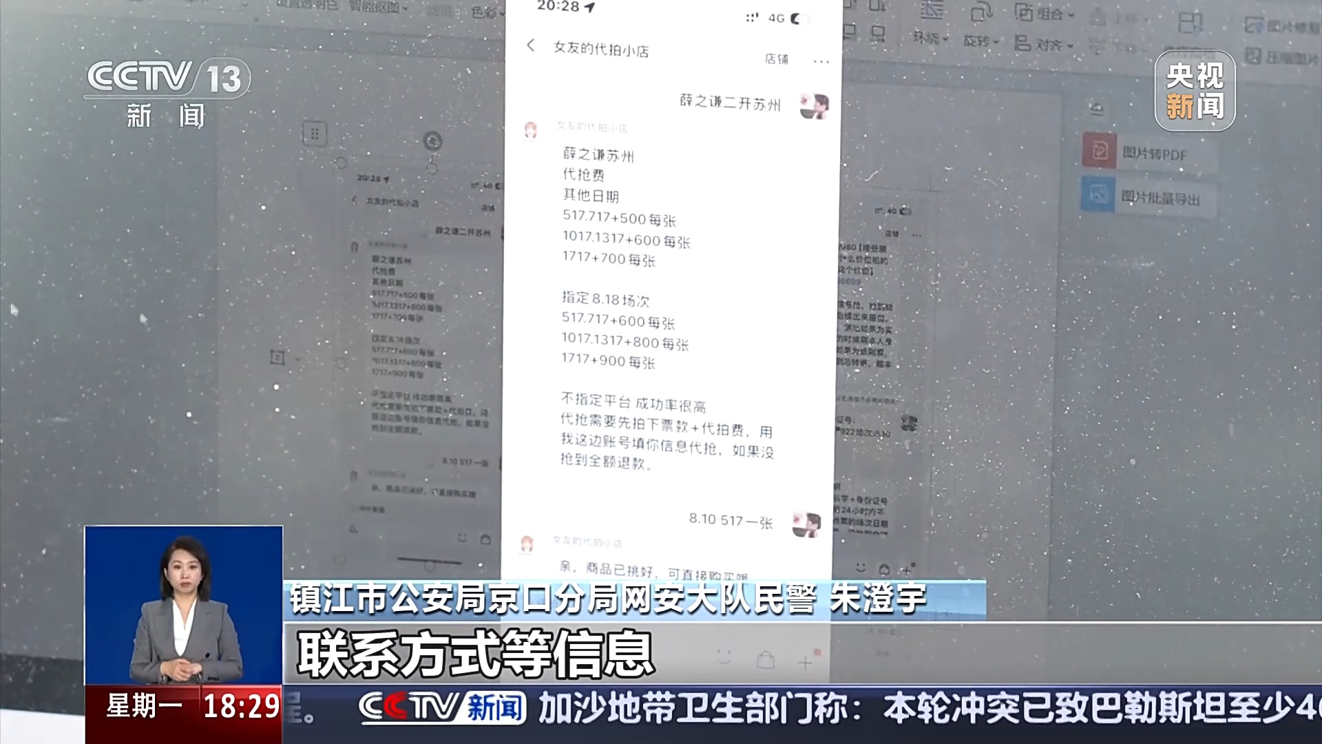 镇江市公安局京口分局网安大队民警 朱澄宇:我们摸排发现,这家网店主打演唱会门票代拍服务。买家只需提供身份证、联系方式等信息,卖家便根据演唱会热门程度和座位稀缺程度,在原价基础上加价200元至数千元不等,为买家代抢门票。而且,他们承诺如果没抢到票,将全额退款。