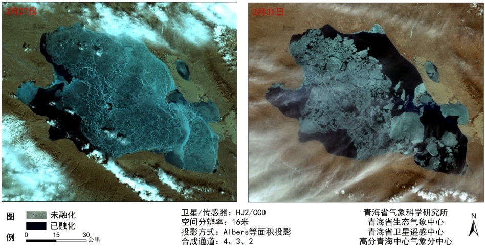 卫星遥感监测显示,青海湖西南部湖冰融化范围形成由湖岸向湖中心呈环状或不规则带状分布的开裂带。其中,布哈河入湖口、铁布卡湾以及黑马河沿岸附近湖冰融化明显,洱海南部已基本融化。3月31日,青海湖融化面积进一步扩大,东部沿岸湖冰明显融化,主湖体出现大面积的冰块和冰裂纹。