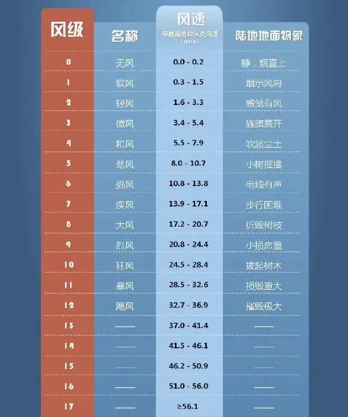 我国《风力等级》国家标准将风力等级依次划分为18个等级。11、12级风陆上很少见,一般当风力超过12级时,就意味着对陆地地面物象“摧毁极大”。