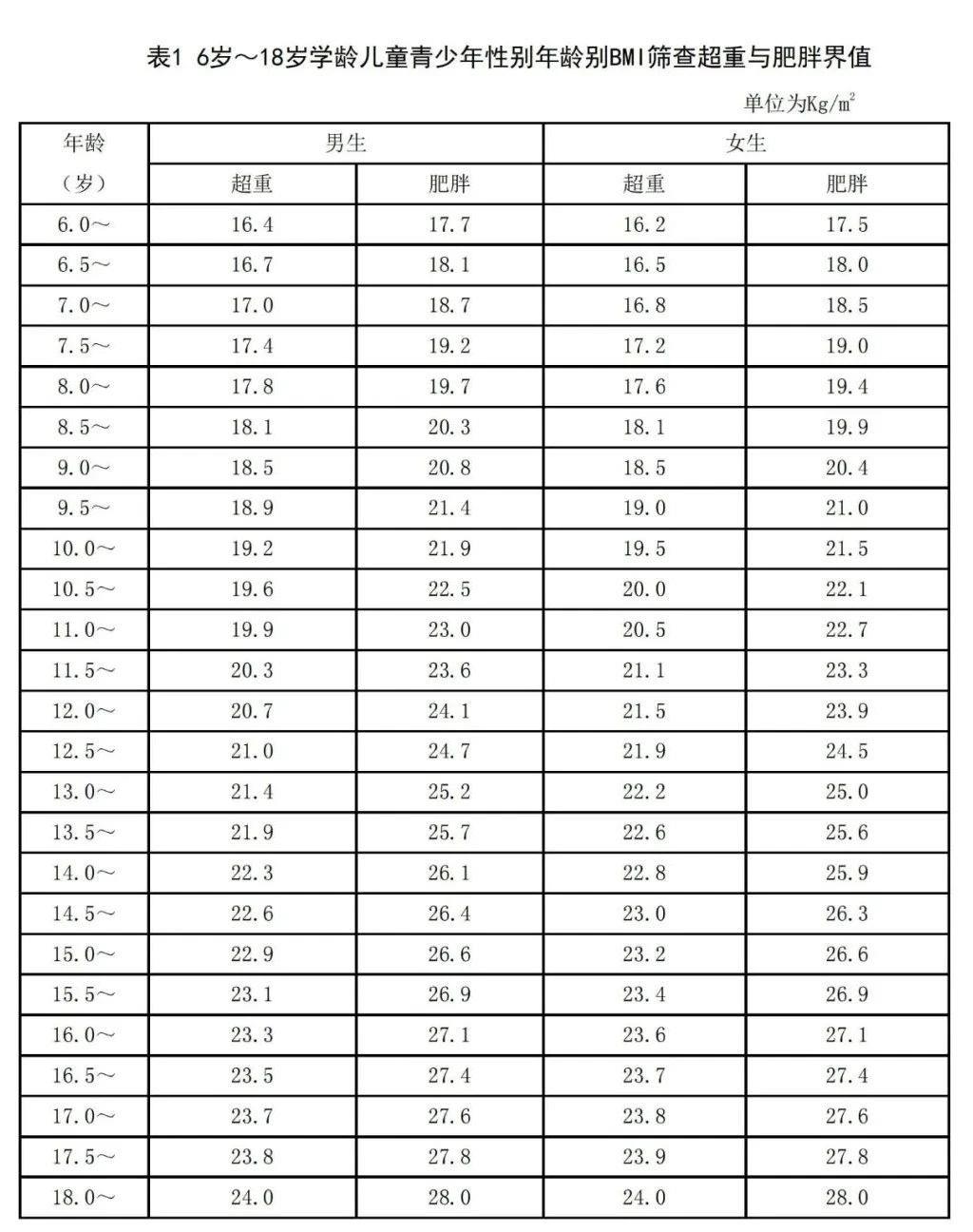 身体质量指数(BMI)是国际社会推荐的评价儿童(≥2岁)超重和肥胖的首选指标,用体重(千克)除以身高(米)的平方即可。我国学龄儿童青少年超重和肥胖筛查BMI界限值如下表:
