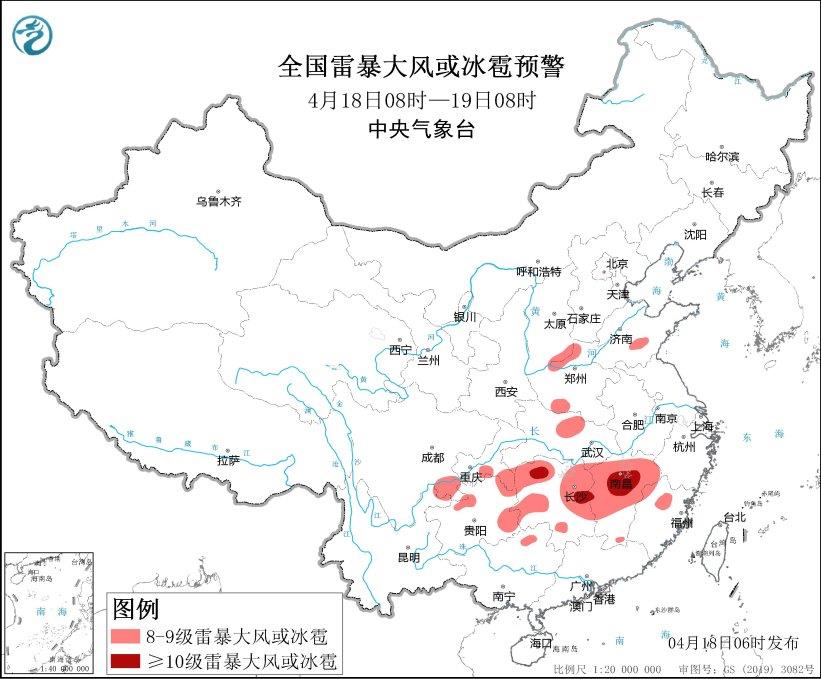 预计4月18日08时至19日08时,西南地区东部、江汉、江南以及河南西北部、山东南部等地的部分地区将有8级以上雷暴大风或冰雹天气,其中,湖南中部和西北部、江西中北部等地的部分地区将有10级以上雷暴大风,最大风力可达11级以上;西南地区东部、江南等地的部分地区将有小时雨量大于20毫米的短时强降水天气,其中,湖南中北部、江西中北部、贵州东南部等地的部分地区小时雨量大于50毫米,最大可达60毫米以上。