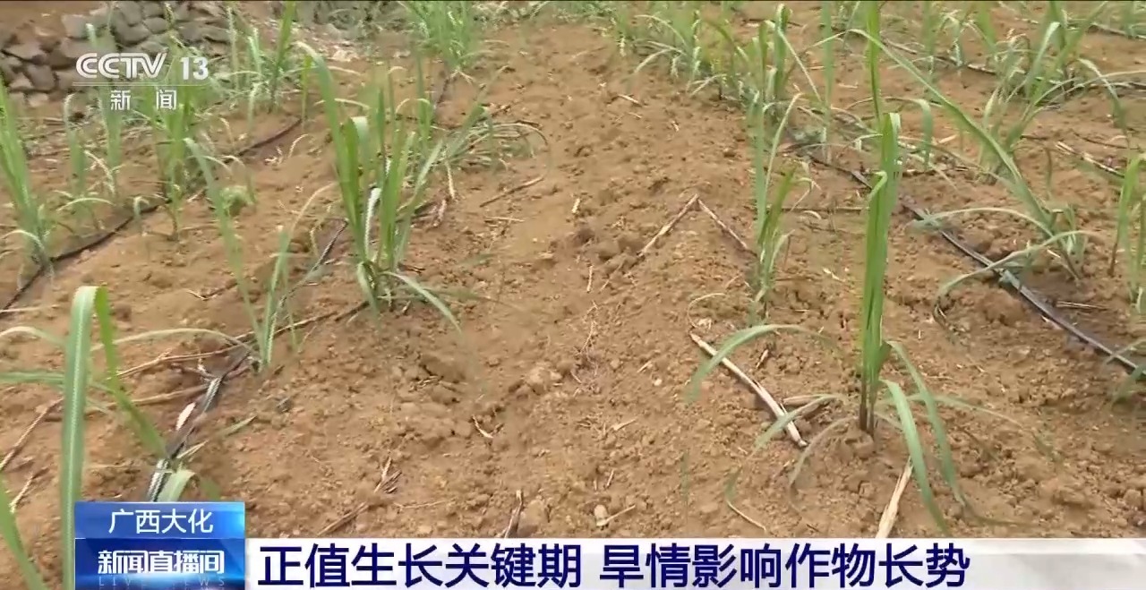 在一片90多亩的甘蔗地,往年4月中下旬,这里已经是绿油油的一片。但是今年受旱情影响,甘蔗长势严重不足,往年此时甘蔗应该有一米多,但现在甘蔗只有30厘米高。而此时正是甘蔗分蘖期,也就是主茎在由低向高生长的关键时刻,缺乏必要的水分,土壤中的养分难以被作物吸收,直接影响甘蔗的生长周期。