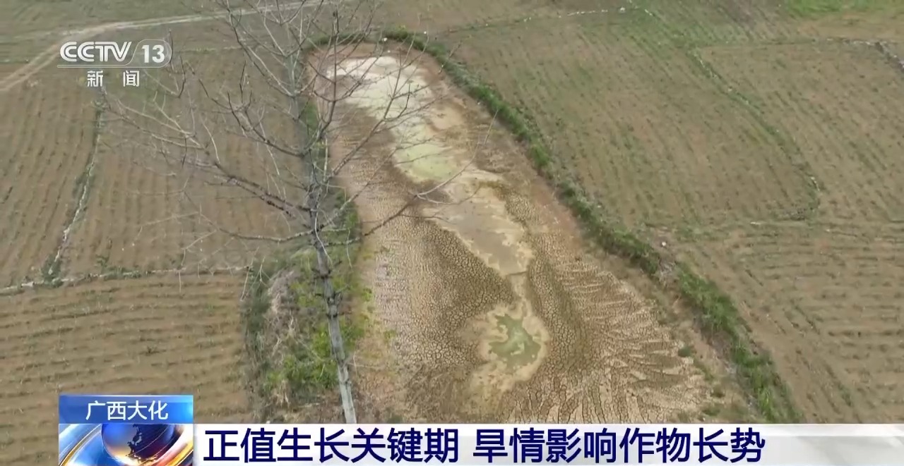 总台记者 王洁:在六也乡的百敢屯,这里原先一个水深接近2米的水塘已经完全干涸,因为缺水,地表土壤出现了很大的裂缝,土壤已经变得异常干燥和坚硬。这个水塘原先是为周边农田进行蓄水灌溉的,通过这个水塘可以直观地感受到旱情对土地的影响。