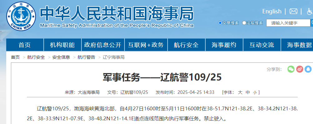 航行警告!渤海海峡黄海北部部分海域执行军事任务