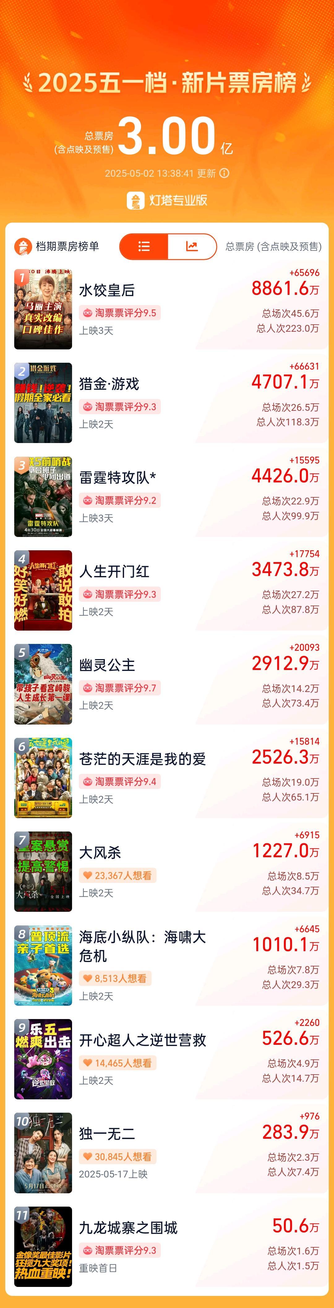 据网络平台,截至5月2日13时38分,2025年五一档电影新片(含重映)总票房(含点映及预售)突破3亿,影片《水饺皇后》《猎金·游戏》《雷霆特攻队*》《人生开门红》《幽灵公主》《苍茫的天涯是我的爱》暂列前六。