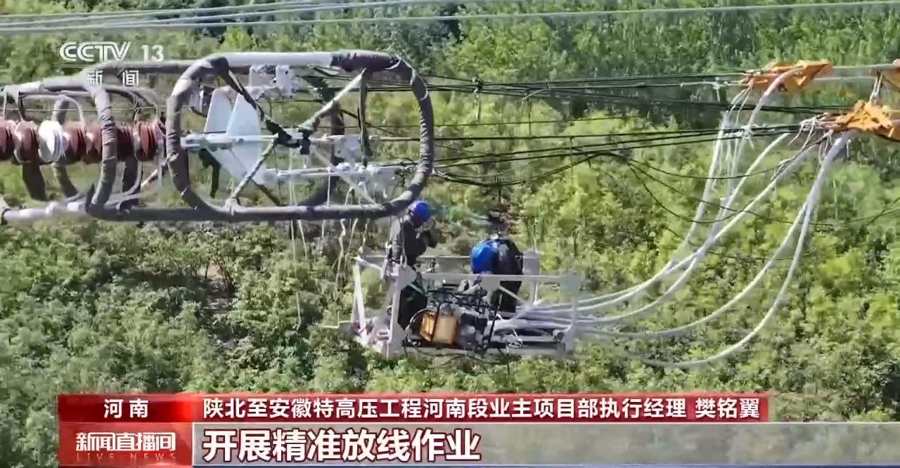随着现场指令发出,一根重达10吨的输电导线被缓缓拉起,经过3个小时作业后,导线安全跨过1000千伏长南线,标志着继陕武线、豫阳线之后,成功完成全部三条特高压线路跨越任务。