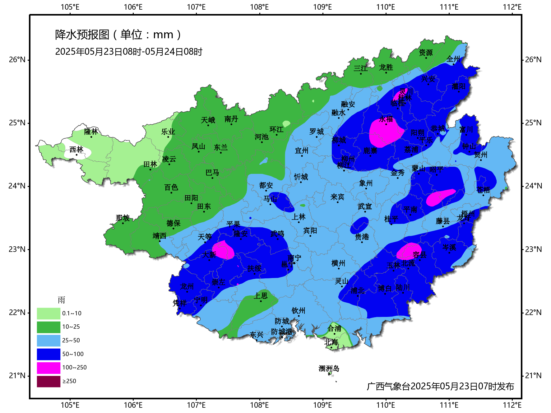 预计未来一周,广西持续有降雨天气。受高空槽、切变线和地面冷空气影响,今天(23日)桂东、桂南有大雨到暴雨、局地大暴雨到特大暴雨并伴有短时雷暴大风等强对流天气,24日广西降雨减弱,以中雨为主。
