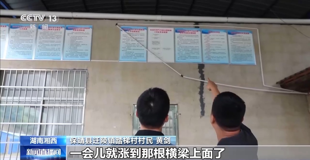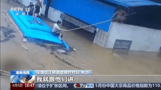黄剑:当时的水很大、很急,水位上涨得很快。一会儿就涨到房屋的横梁上面。我沿着横梁过去,距离他们大概有5米左右,我跟他们说“我用竹竿把你们一个个拉过来,但是不管是什么情况,你们的手不能放开。”