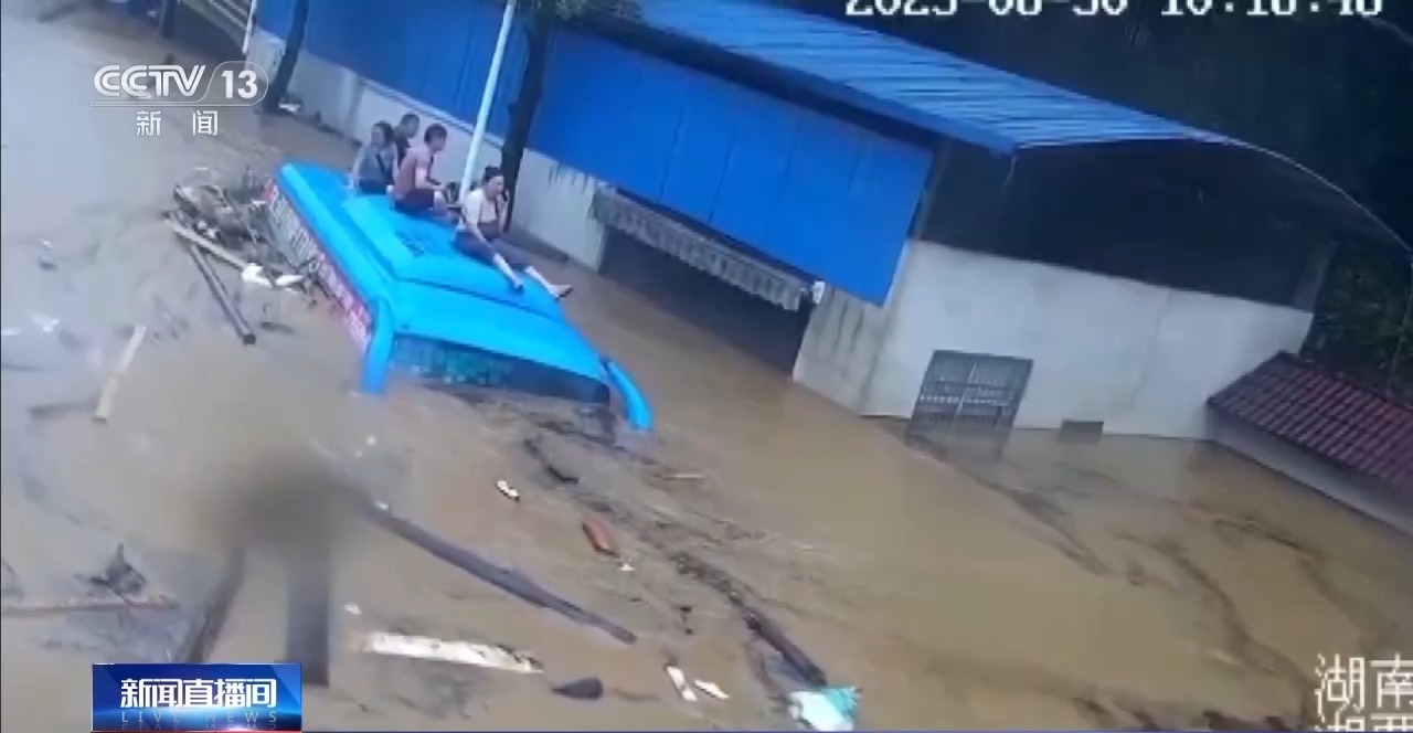没多久,他们在不远处的一辆公交车顶上,发现有4人被困,当时洪水持续暴涨,已经快漫过车顶,情况十分危急。