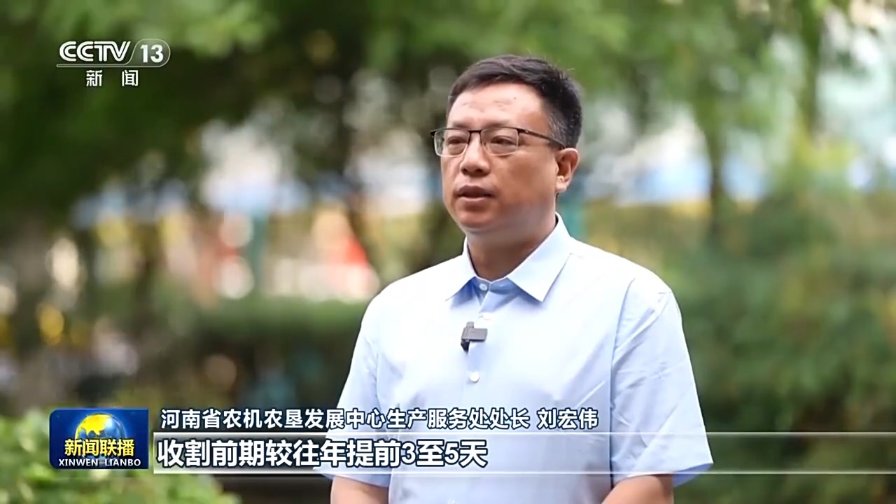 河南省农机农垦发展中心生产服务处处长 刘宏伟:收割前期较往年提前3至5天,每秒10公斤喂入量的收割机成为主力机型,全省有12天日收获小麦超过300万亩,最高日收获小麦715万亩。