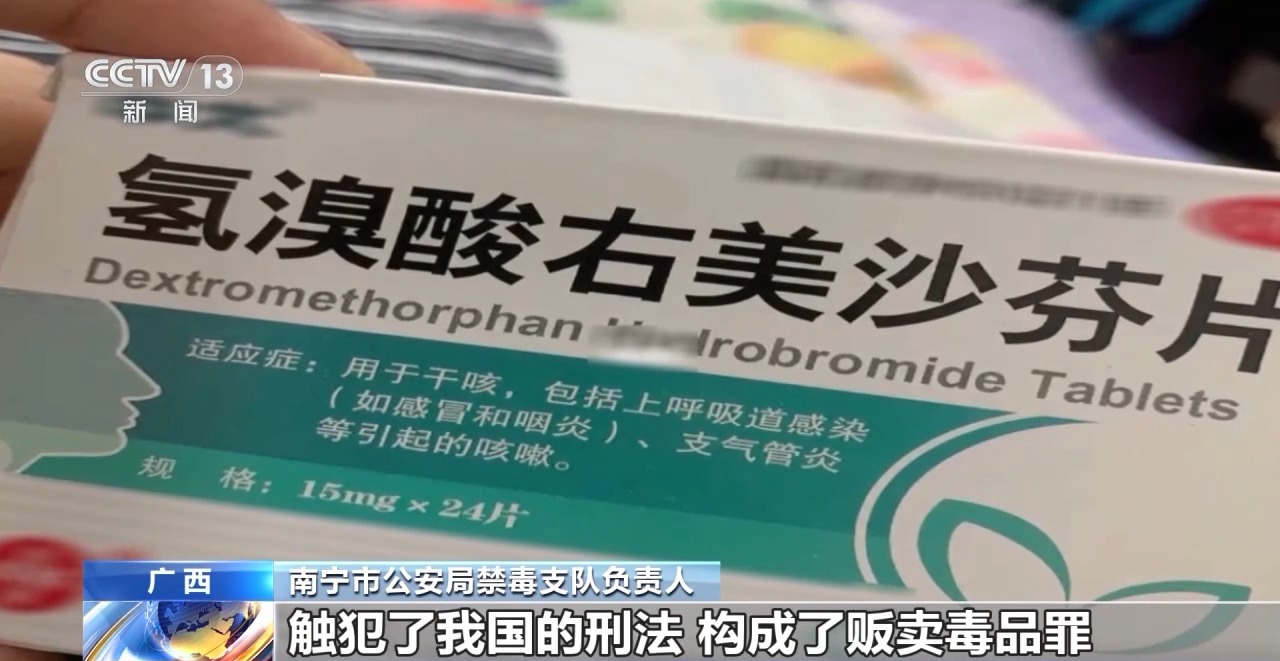 南宁市公安局禁毒支队 民警:这个主要犯罪嫌疑人韦某,在售卖右美沙芬的时候,她为了规避公安机关的打击,首先是将出售的右美沙芬片的外包装用一些其他的盒子、药盒来伪装。第二个,她是只卖熟人,第三个特点,她会在线上来跟购买人员联系,然后通过线下用同城快送的方式,来将右美沙芬送至这个购买人员的手中。