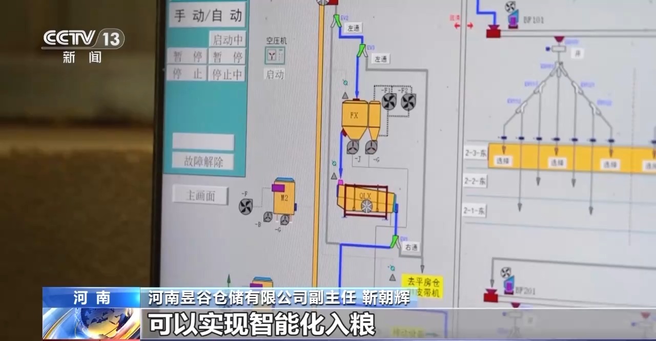河南昱谷仓储有限公司副主任 靳朝辉:楼房仓每层都具有分流卸粮管道,通过电脑一键操作,可以实现智能化入粮,让粮食也能“坐”电梯、“住”楼房。以50吨装粮量的货车为例,以往卸车需要30分钟,如今只需要15分钟。