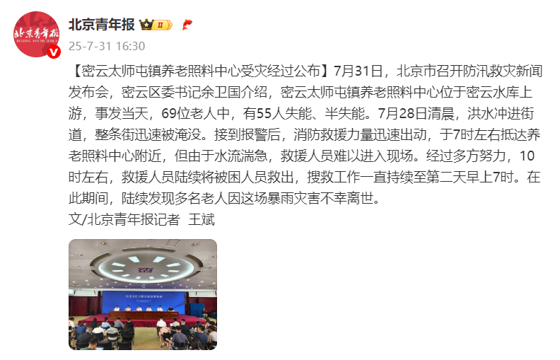 7月31日,北京市召开防汛救灾新闻发布会,密云区委书记余卫国介绍,密云太师屯镇养老照料中心位于密云水库上游,事发当天,69位老人中,有55人失能、半失能。7月28日清晨,洪水冲进街道,整条街迅速被淹没。接到报警后,消防救援力量迅速出动,于7时左右抵达养老照料中心附近,但由于水流湍急,救援人员难以进入现场。经过多方努力,10时左右,救援人员陆续将被困人员救出,搜救工作一直持续至第二天早上7时。在此期间,陆续发现多名老人因这场暴雨灾害不幸离世。