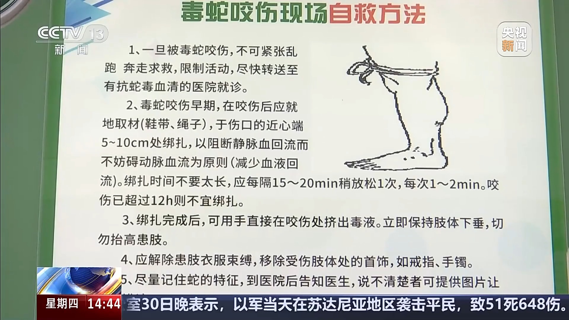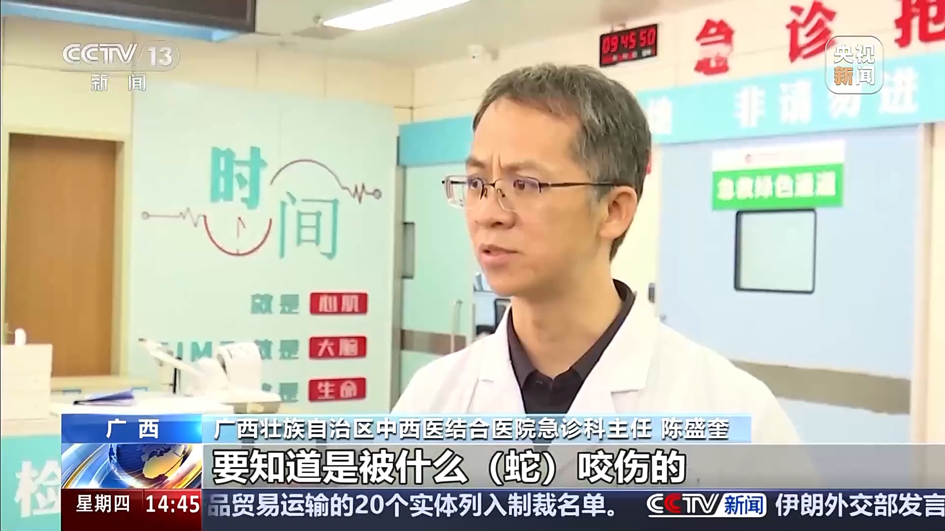 广西壮族自治区中西医结合医院急诊科主任陈盛奎:要知道是被什么蛇咬伤的,包括它的特征这个是最重要的,第二马上拨120的救治电话,尽量避免激烈地活动,不要自己走路去医院,有水的话,尽量用水或者肥皂水,大量的水去冲洗伤口。