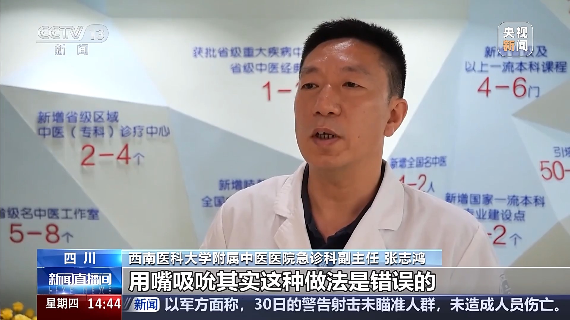 西南医科大学附属中医医院急诊科副主任 张志鸿:用嘴吸吮其实这种做法是错误的,因为在吸吮的过程当中,吸出来的毒素进入口腔,有可能通过口腔破损的黏膜吸收,从而导致中毒,也就是说增加了一个中毒的病人。第二在吸吮伤口的过程当中,也可能对伤口造成污染,从而导致感染。