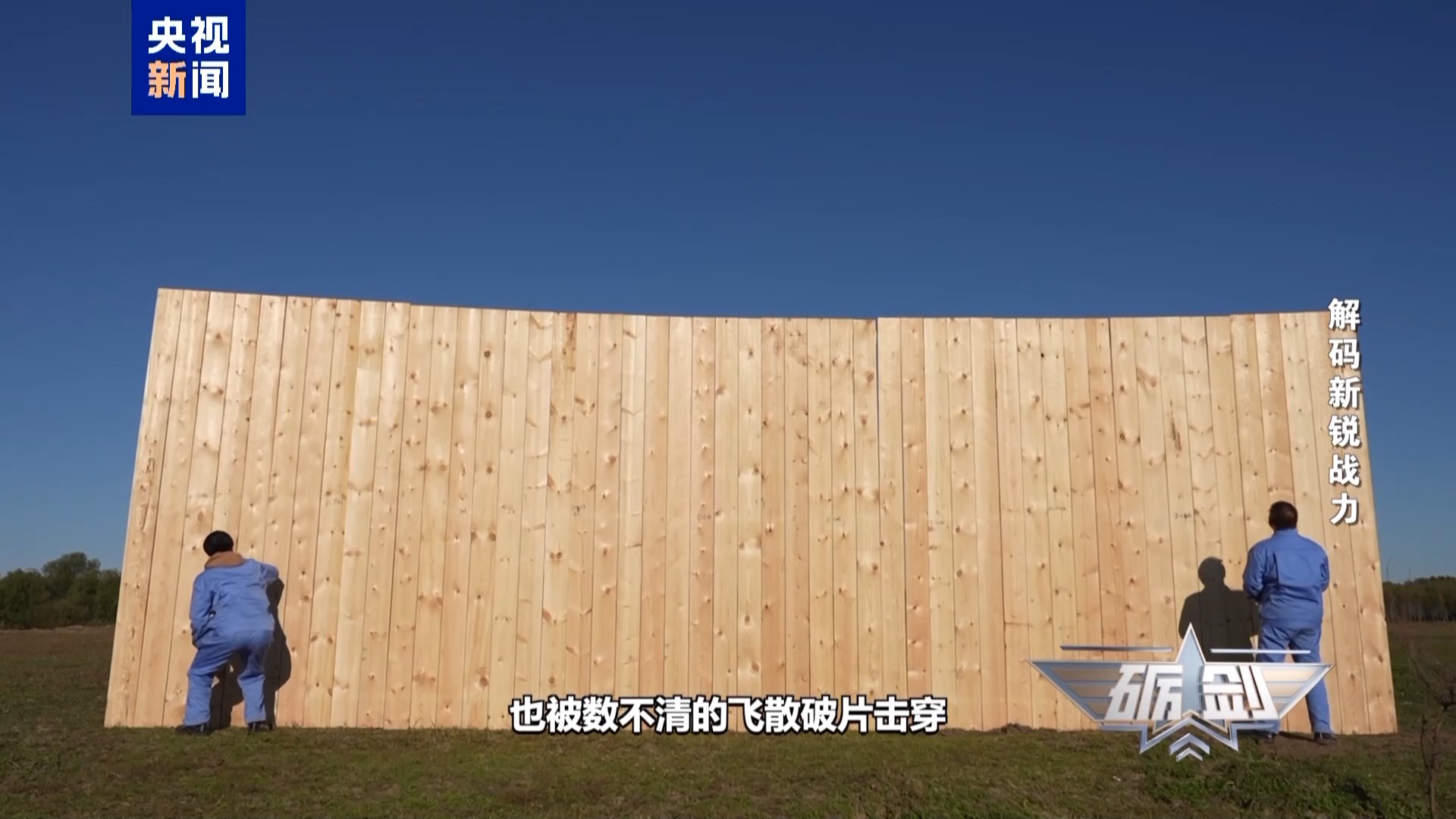 更远的位置有一块巨大的松木板,用来检测破片的密度以及对于人员等软目标的杀伤能力。