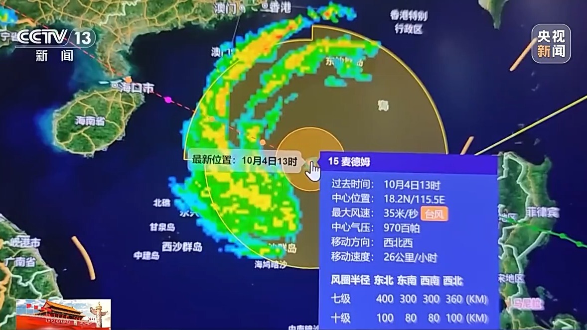广东省气象台首席预报员 张录青:受麦德姆的影响,南海北部已经出现6~9级阵风,7~10级的大风。预计4日的白天到6日早晨,南海北部海面、广东省中西部海面和北部湾海面将有强风。