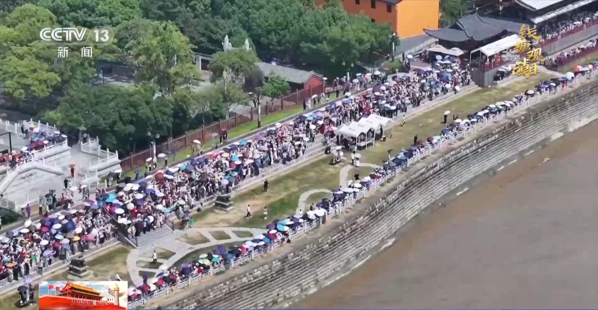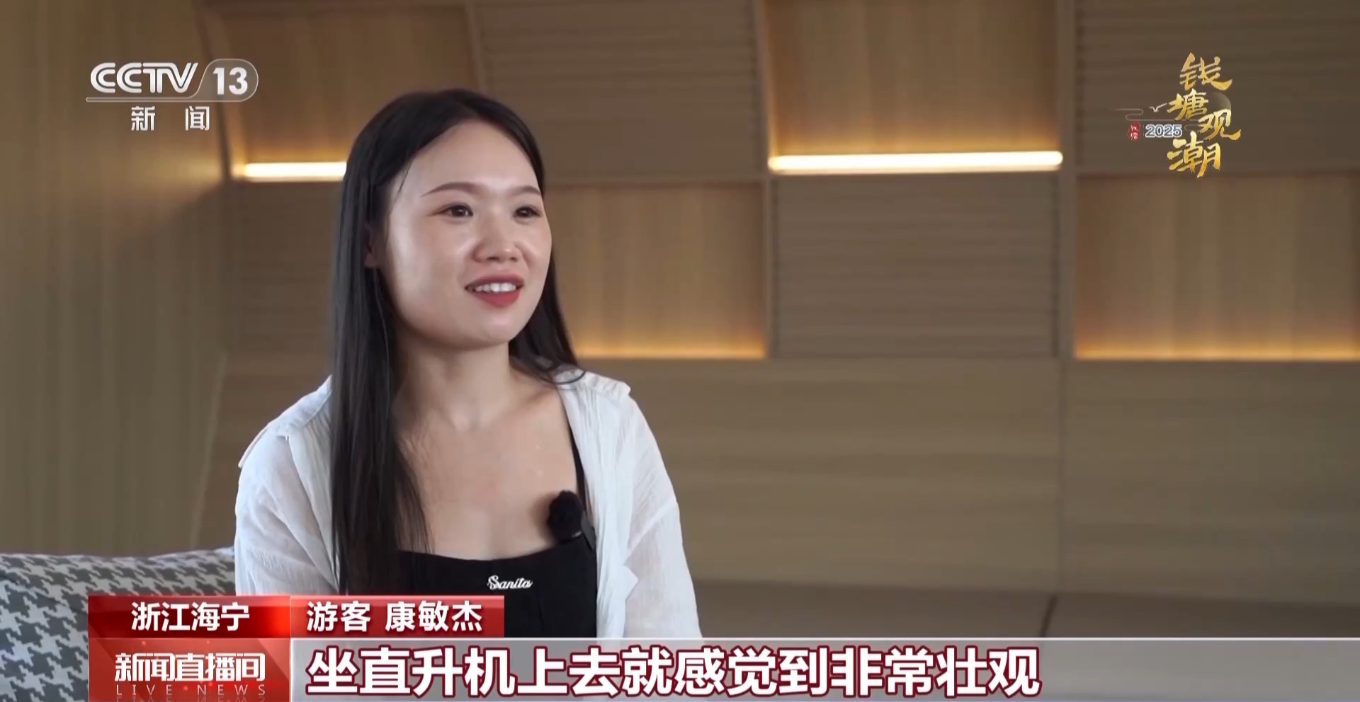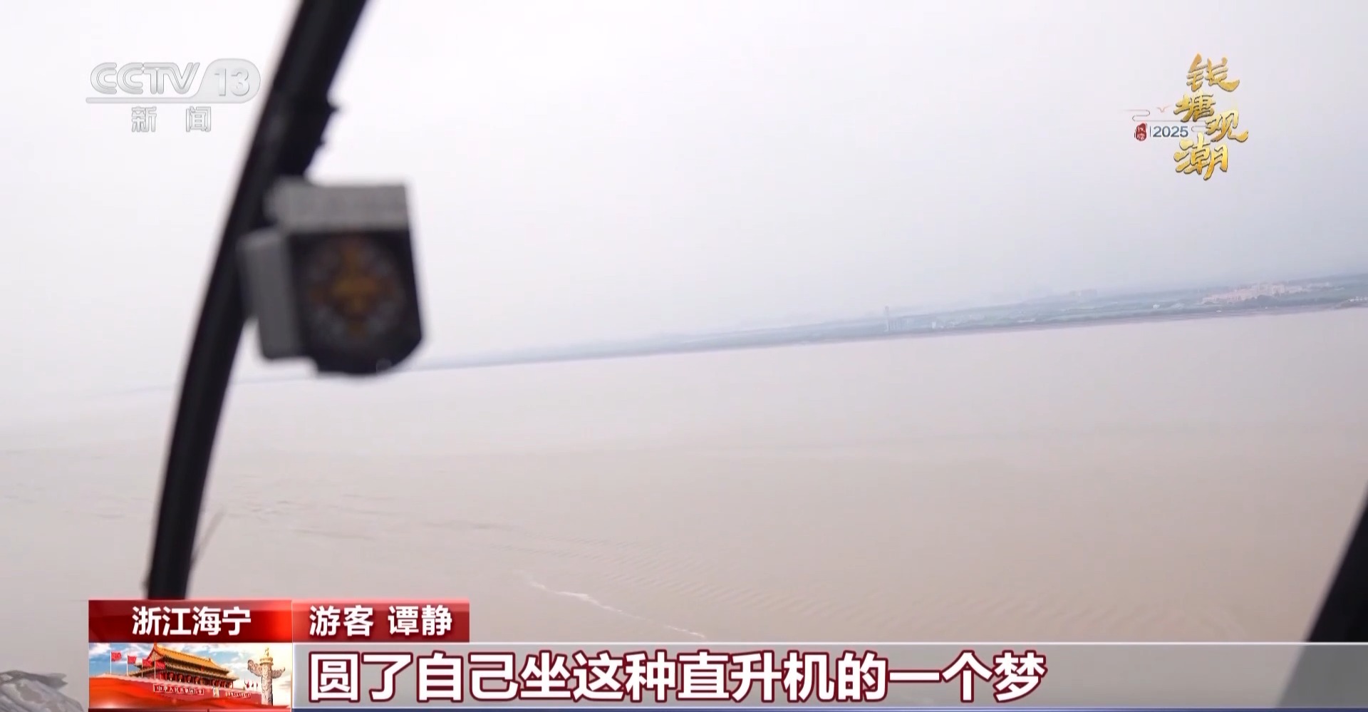 在钱塘江潮水到来的这几天,总台记者用大量的空中视角展现了钱江潮的独特魅力。前不久,海宁的首个航空飞行营地建成了,游客可以坐上直升机,在空中领略钱江潮的风采。