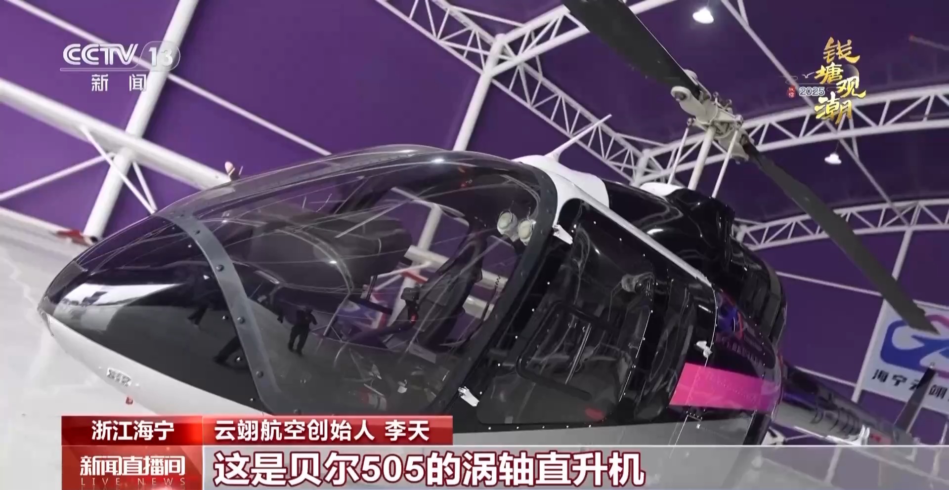 云翊航空创始人 李天:这是贝尔505涡轴直升机。因为我们在钱塘江面上进行飞行,所以我们有应急浮筒,这个是比较少见的。如果有什么特情,就能漂在江面上。这两架飞机都是国产的。