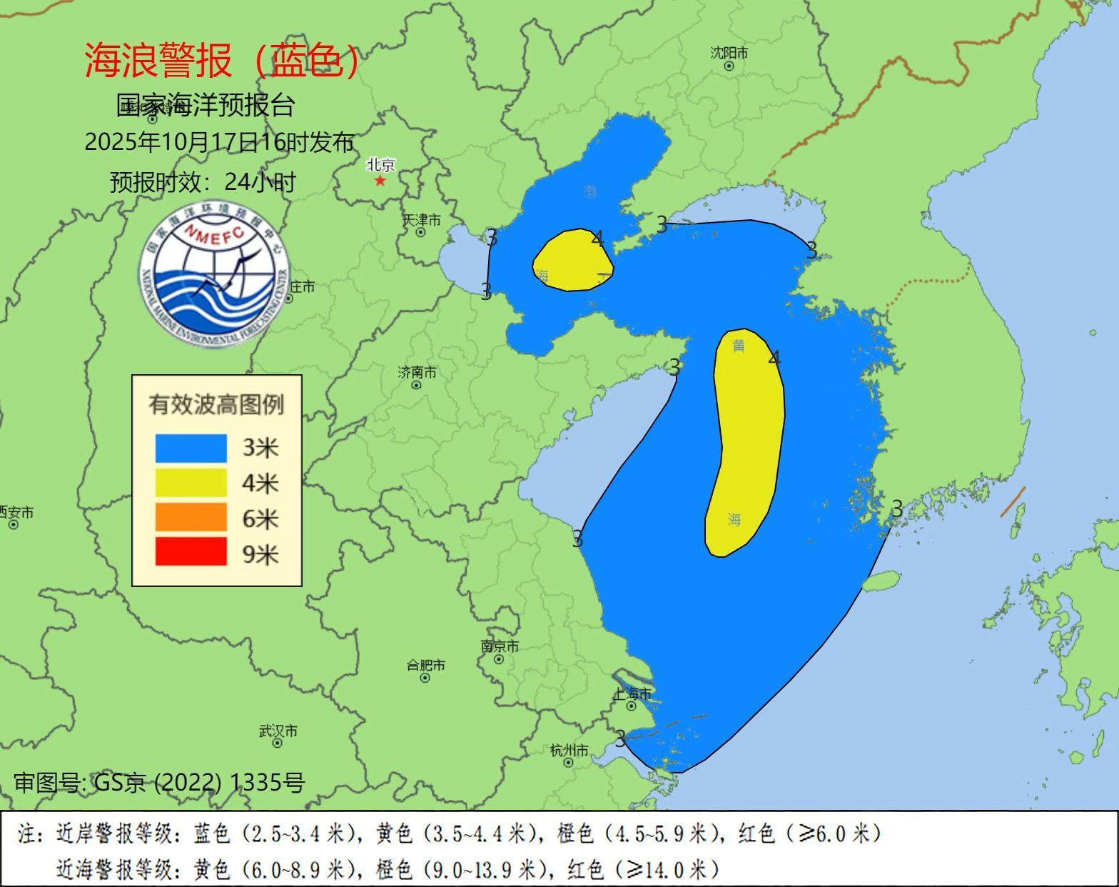 预计到明天下午,渤海、黄海、东海北部将出现2.5到4米的大浪到巨浪区;辽宁西部、河北、山东北部、东部、江苏、上海、浙江北部近岸海域将出现2到3.3米的中浪到大浪。