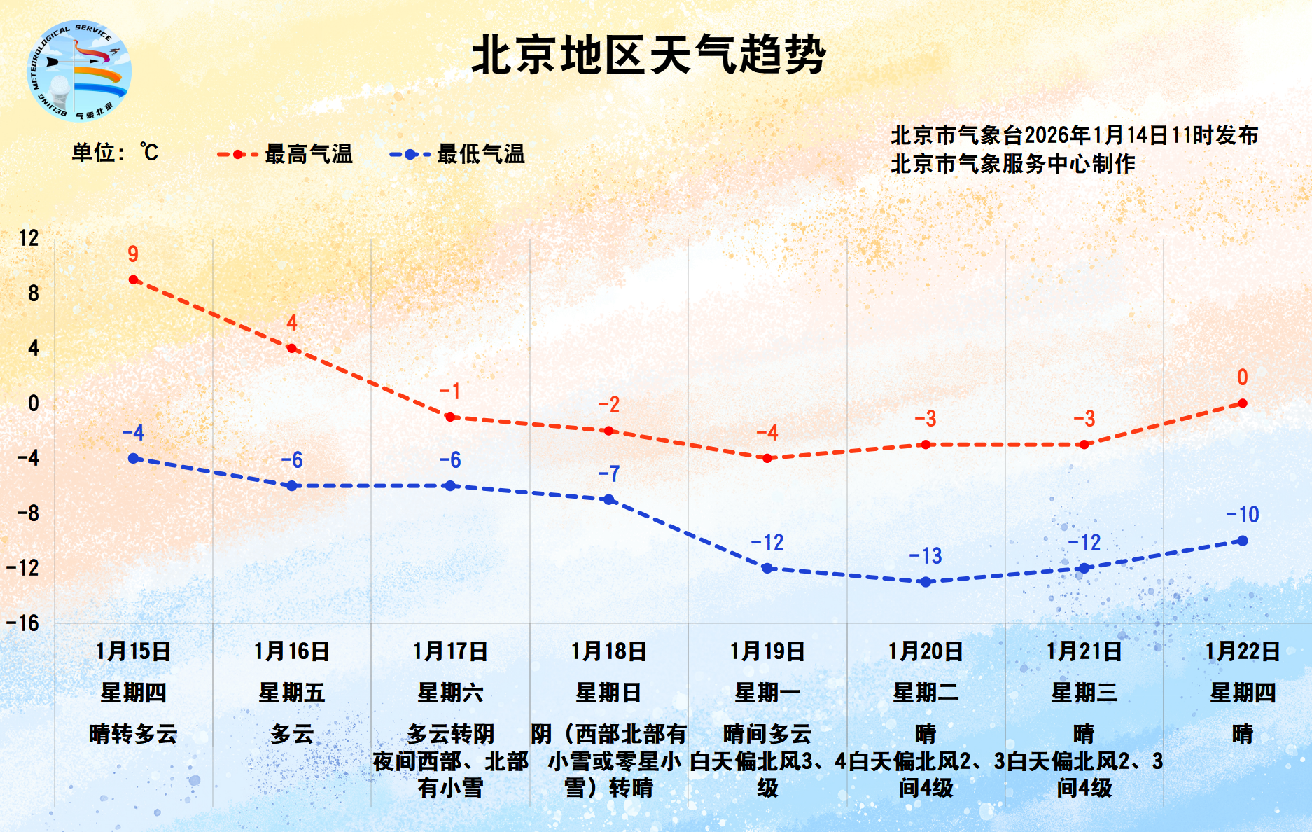 北京市气象台14日17时发布:今天傍晚至夜间多云转晴,傍晚西部、北部有零星小雪或雨夹雪,南转北风一二级,最低气温-4℃;明天白天晴转多云,北转东风二三间四级,最高气温9℃。今天夜间大气扩散条件转差,能见度不佳,驾车出行注意交通安全。1月14日傍晚,昌平区、延庆区迎来降雪天气。