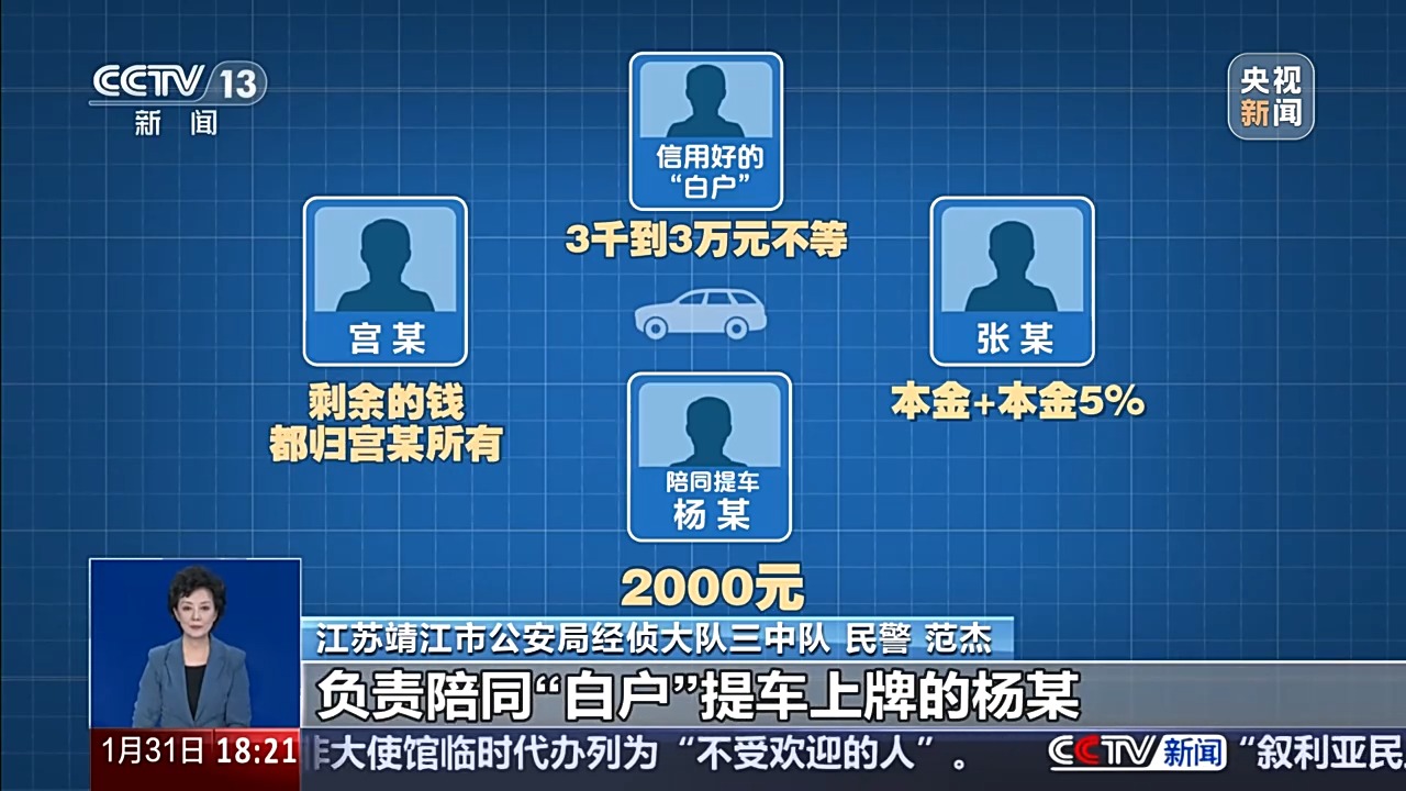 江苏靖江市公安局经侦大队副大队长 陈蛟:2023年6月,主犯宫某与张某合谋,由张某出资垫付购车首付款,宫某负责寻找信用良好的人员去贷款,他们把这类人称为“白户”。两个月时间内,该团伙就从全国找了40多名“白户”。