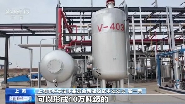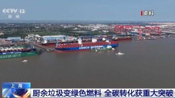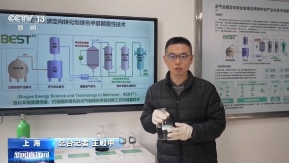 总台记者 王殿甲:我手里装的这瓶透明液体,就是本次绿色甲醇中试试验中取得的样品。经过第三方的检测,它的纯度高达99.99%。那么它的原料就来自于上海厨余垃圾产生的沼气,凭借其成本优势,一旦大规模量产,就能够大幅提升绿色甲醇在船用燃料领域的占有率。