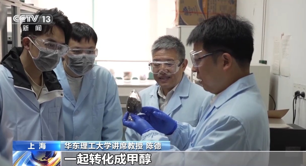 华东理工大学讲席教授 陈德:这项技术的核心就是利用我手里这两款新型催化剂让绿色甲醇合成技术不“挑食”,能够把沼气里边约三成的二氧化碳和七成的甲烷一起转化成甲醇,碳原子利用率可以达到100%。我们已经在中试装置连续运行出合格的绿色甲醇产品,而且拿到了欧盟ISCC体系的双认证,证明我们工艺路线和碳足迹核算符合国际可持续燃料标准。