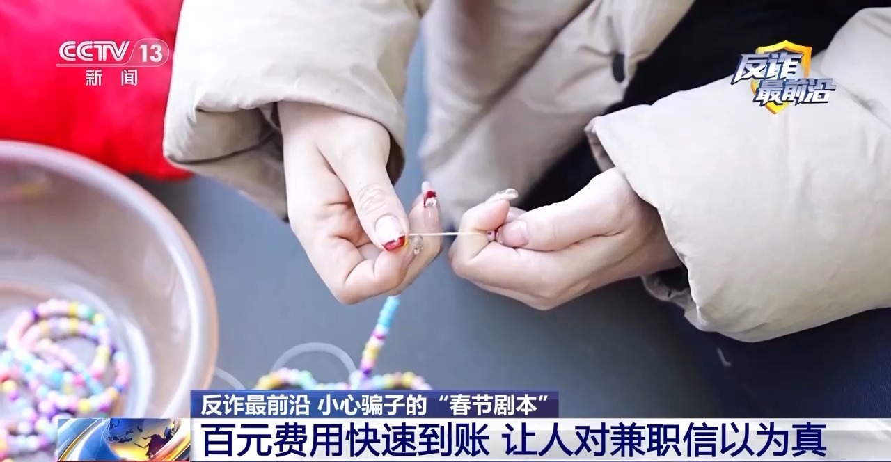 国家反诈中心民警 芦森林:串珠诈骗其实它类同于之前的刷单返利类,它是一种新型的变异的形式。第一就是凡是让你先交押金或者材料费的,大家一定要警惕,因为正规的合作,他这个材料费都是由企业来承担,只要让你先交钱先垫付押金的,基本上都是诈骗。第二就一定要查验资质,走正规渠道。第三点就是别信小额试错,很多被害人都觉得先小投一笔试一试,没问题再继续追加,而诈骗分子往往就是利用了被害人这种心理,用这种小额返利的方式,让你一步一步陷入陷阱,掉进诈骗的深渊里。