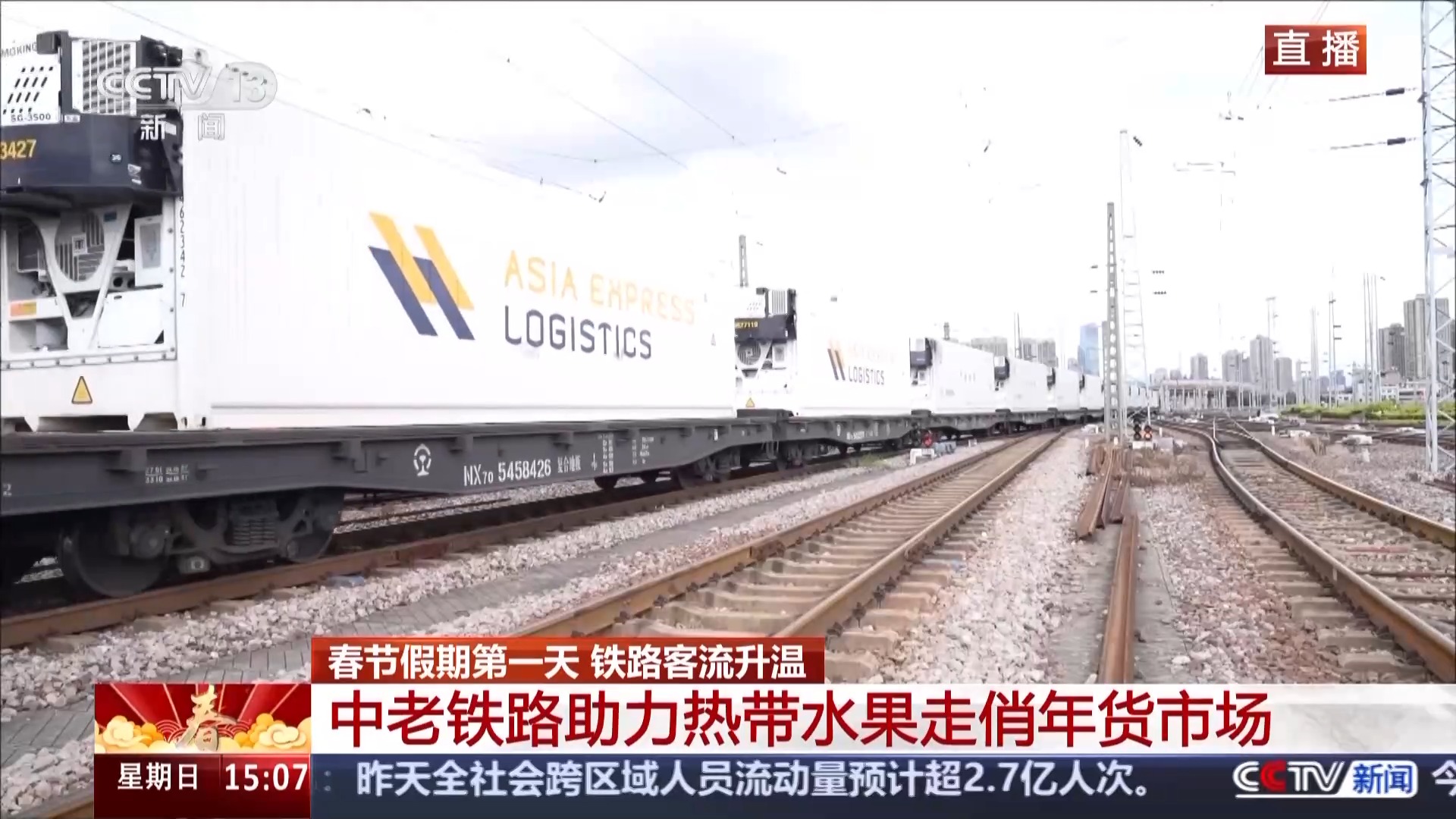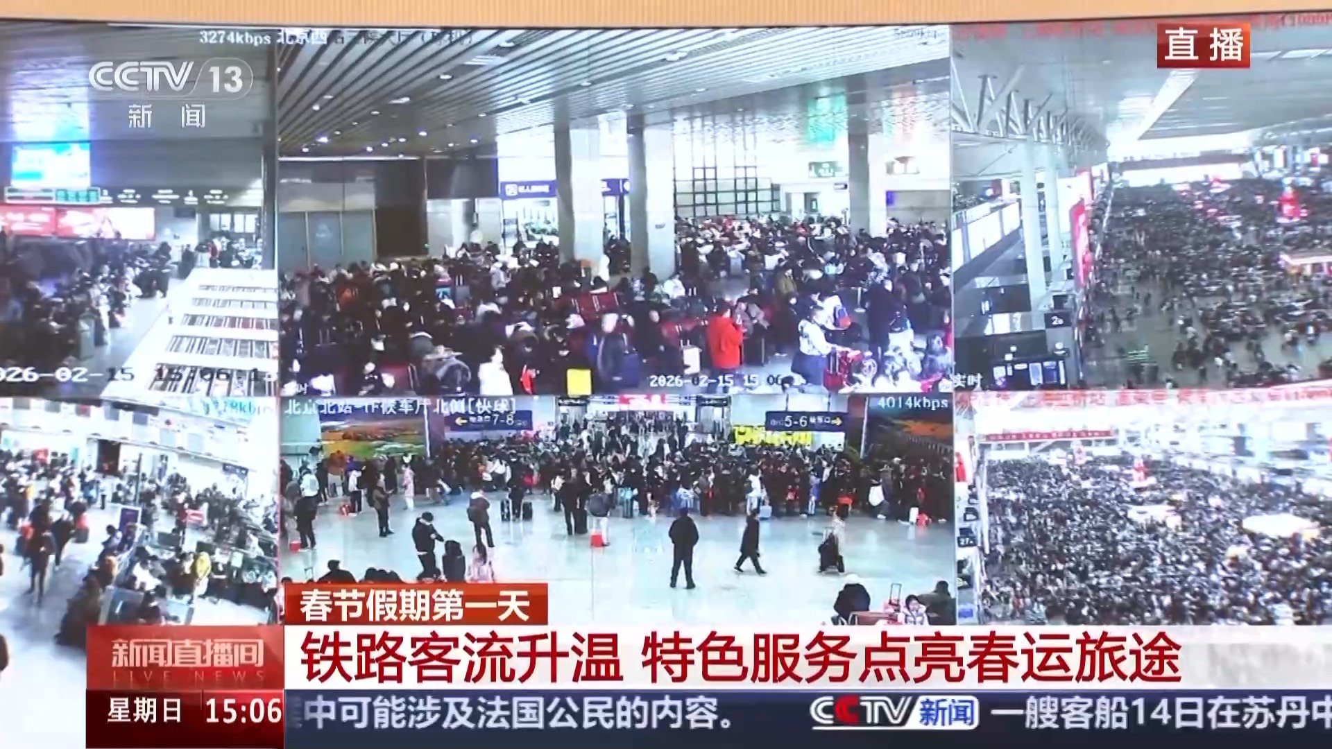 总台央视记者 陈晰:今天是腊月二十八,通过调度大屏,可以看到全国一些重点区域铁路枢纽客流的实时情况。下午3点,一天当中出行相对集中的时段,可以看到全国铁路重点区域客流平稳有序,长三角、珠三角、京津冀、成渝等区域依旧是热门的出发和到达区域。今天,全国铁路预计发送旅客1395万人次,计划加开旅客列车1568列。