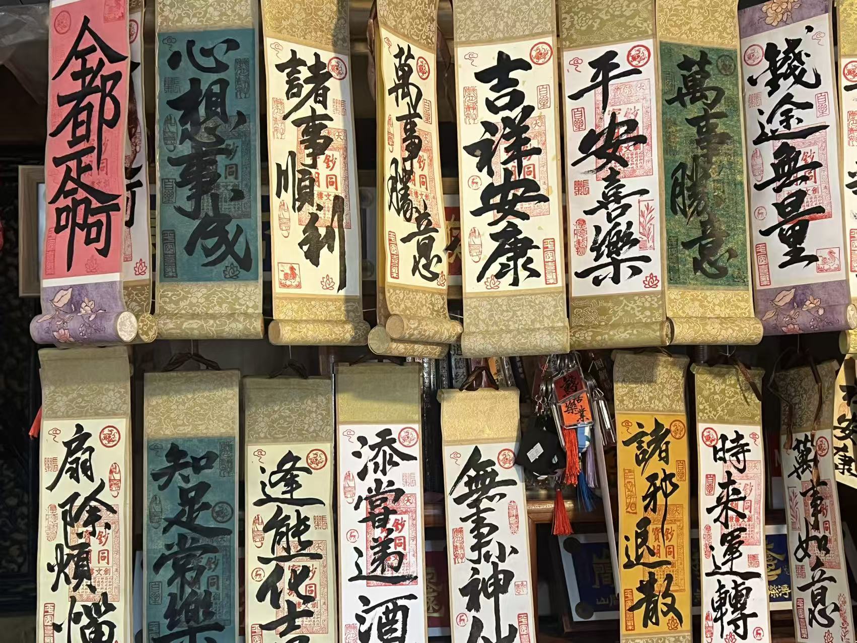 钱财喜福赢开心,春风再送吉和运,王建宇特意挑一支灰鼠毫,笔锋硬中带软,既有骨力又有肉感,墨汁流淌,年味就在笔尖的起落之间。过大年,家家户户贴春联,换上精心创作的合体字春联,小店也迎来了新一年。
