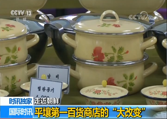 如今,店内销售的产品从蛋奶粮油到日用百货再到大宗电器,基本都由朝鲜本国工厂生产,不仅质地优良,价格也相对便宜。比如这个书包,价格约合人民币25元;而这些搪瓷制品,每件的价格也多在人民币10元左右,朝鲜民众基本能够接受。在纺织品专区,各色布料和成衣的种类也愈发丰富。