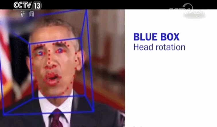 计算机科学专家 法里德: 首先我们会测量各种头部移动和面部表情,你可以在这个视频里,看到我们正在捕捉蓝色盒子,正在捕捉他的头部在三维空间里如何转动。红点是在定位他的面部表情,实际上我们可以看到他何时会抬起眉毛,何时会张大嘴巴。当然,他眼睛里的绿色激光会告诉我们他在看哪里。整个视频中的每一帧画面,我们都会对他的面部表情、面部动作、头部动作做一些测量,之后我们用这些建立软生物识别模型。