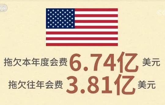 根据联合国此前数据,10月份联合国会费欠款高达13亿美元,其中7个国家(美国、巴西、阿根廷、墨西哥、伊朗、以色列和委内瑞拉)就占了97%,而美国拖欠本年度会费6.74亿美元,拖欠往年会费3.81亿美元,又占了最大头。