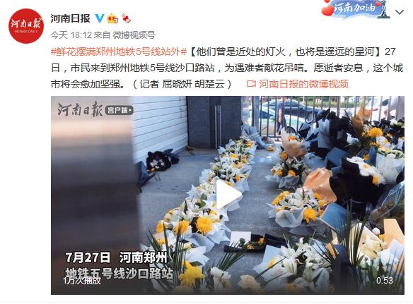 #鲜花摆满郑州地铁5号线站外#【他们曾是近处的灯火,也将是遥远的星河】27日,市民来到郑州地铁5号线沙口路站,为遇难者献花吊唁。愿逝者安息,这个城市将会愈加坚强。(记者 屈晓妍 胡楚云)