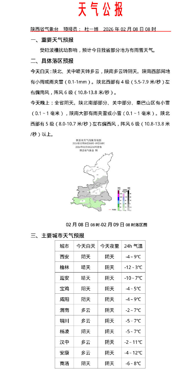 9日: 全省阴天。陕北南部部分、关中部分、秦巴山区有小雪(0.1~1毫米),陕南大部有雨夹雪或小雪(0.1~1毫米),秦巴山区西段有中雪(2.5~3.5毫米)。陕北西部有5级(8.0~10.7米/秒)左右偏西风,阵风6级(10.8~13.8米/秒)以上。