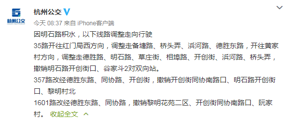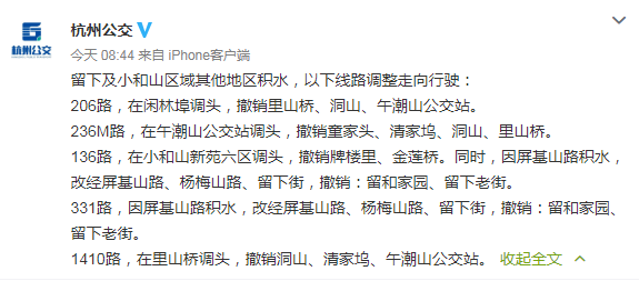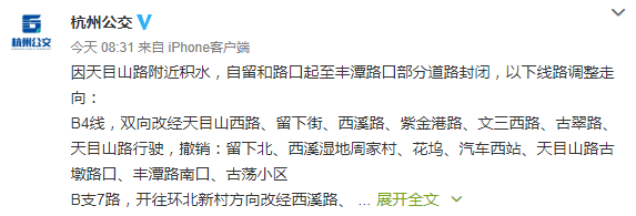 今天上午8:31,据@杭州公交 :因天目山路附近积水,自留和路口起至丰潭路口部分道路封闭 ,以下线路调整走向: