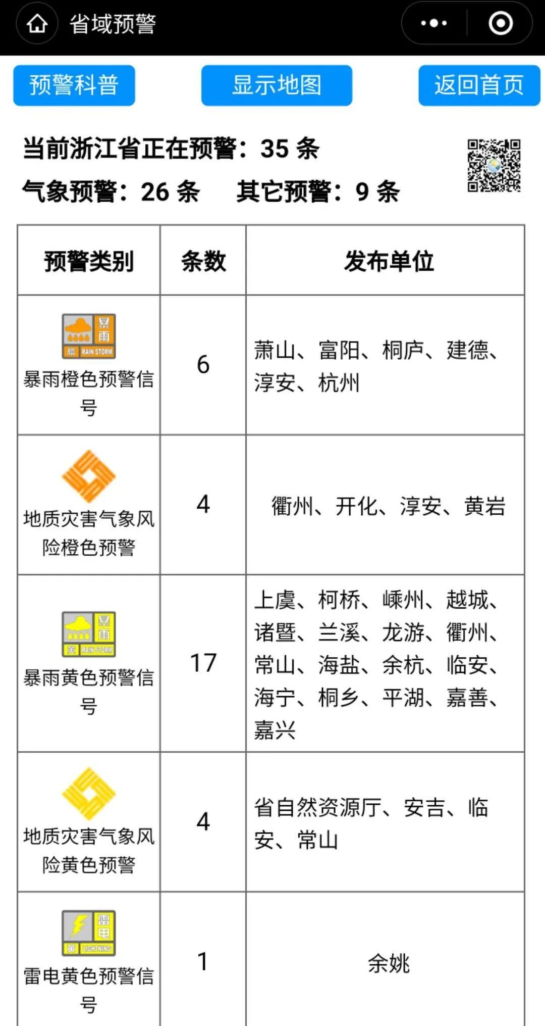 截至上午10点50分,浙江共发布35条预警信息。萧山、富阳、桐庐、建德、淳安、杭州发布暴雨橙色预警信号 ,嵊州、越城、诸暨等17地发布暴雨黄色预警信号 。