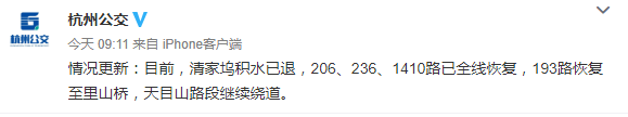 截至9:11,清家坞积水已退,206、236、1410路已全线恢复,193路恢复至里山桥,天目山路段继续绕道 。