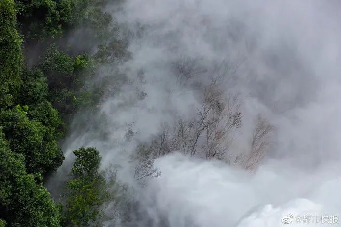 摄影记者:这是我此次新安江开闸泄洪拍到的,感觉最震撼的一张照片:九孔全开的洪流掀起狂风暴雨。席卷附近山上的植被。一边正值盛夏。草木葱茏。一边叶落树秃。宛如寒冬。