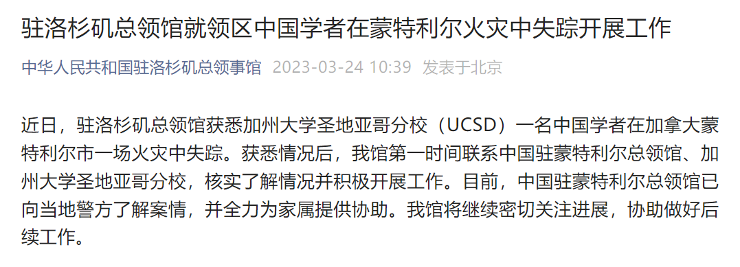 3月24日,驻洛杉矶总领馆发布“就领区中国学者在蒙特利尔火灾中失踪开展工作”的通告。